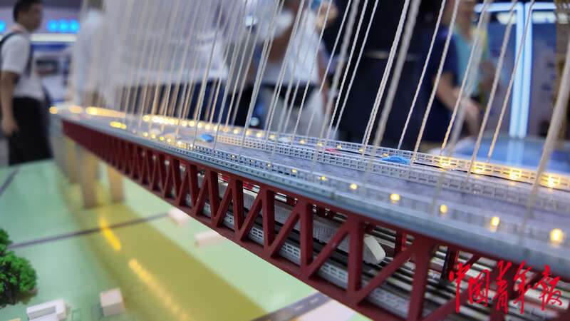 7月8日,第十七届中国国际现代化铁路技术装备展览会,中国中铁展位上的巢马公铁长江大桥等比例模型。中青报·中青网见习记者 陈思阳/摄