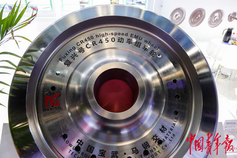 7月8日,第十七届中国国际现代化铁路技术装备展览会上复兴号CR450动车组车轮。中青报·中青网见习记者 陈思阳/摄