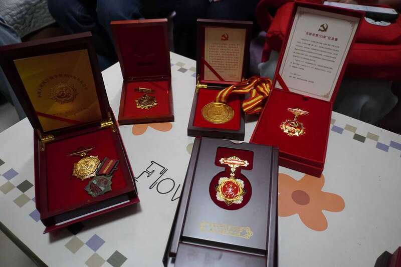 红色故事采风团第一小组成员在采访张群堂老英雄的过程中得知,张群堂老人生于1929年,8岁时便加入了抗日儿童团。在抗日战争时期,他跟随母亲在军营村一边上学,一边积极参加抗日游击活动。1944年,张群堂在老乡的介绍下进入纺织厂成为工人,他不仅学会了纺织技术,还把织成品全部送往抗日前线。张群堂将自己获得的奖章向实践团成员们一一展示,珍藏的勋章,无声诉说着那段可歌可泣的岁月。参加暑期社会实践的大学生认真记录,无不被老英雄在国家危亡之际挺身而出、舍生忘死的壮举所震撼。