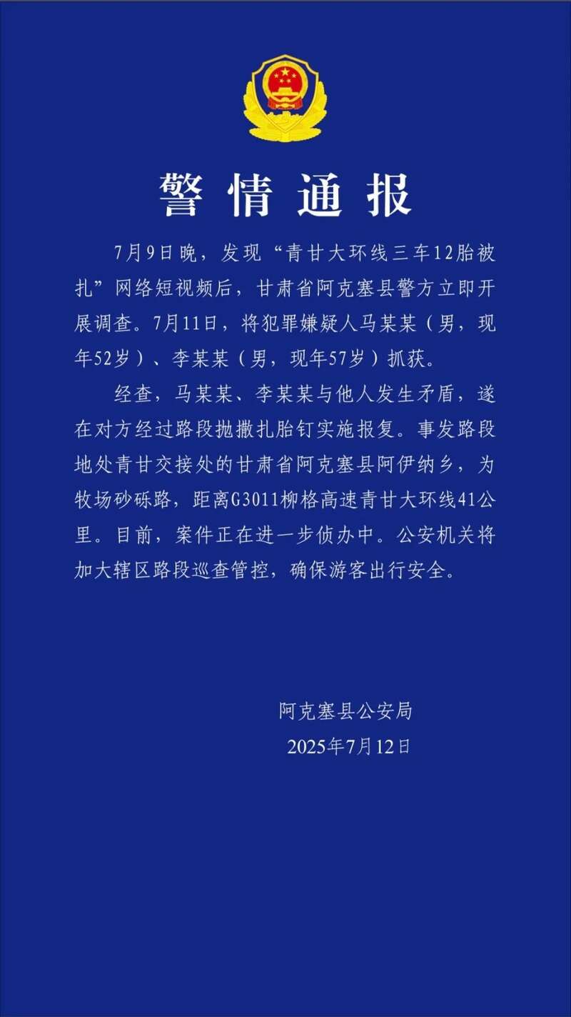 中新网7月12日电 据阿克塞发布微信公众号消息,甘肃省阿克塞县公安局7月12日发布警情通报,具体内容如下: