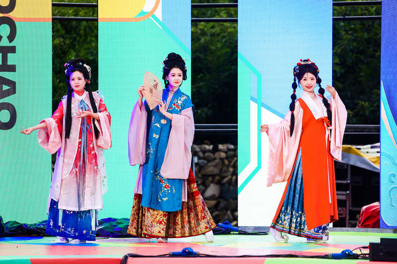 活动以“福韵华赏”国潮服饰秀开场,繁星雅乐乐团、仙水乐队等将摇滚与国潮融合,更有国风群舞、《秦王点兵》舞蹈及高跷、杂技等传统节目,呈现出传统与现代交织的风采。
