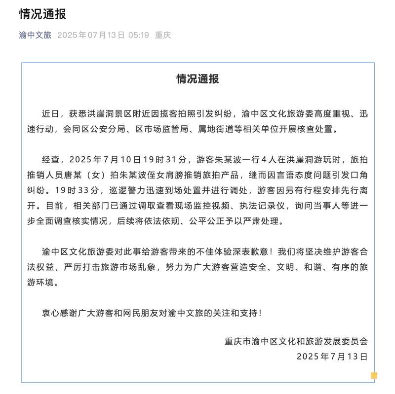 经查,2025年7月10日19时31分,游客朱某波一行4人在洪崖洞游玩时,旅拍推销人员唐某(女)拍朱某波侄女肩膀推销旅拍产品,继而因言语态度问题引发口角纠纷。19时33分,巡逻警力迅速到场处置并进行调处,游客因另有行程安排先行离开。目前,相关部门已通过调取查看现场监控视频、执法记录仪,询问当事人等进一步全面调查核实情况,后续将依法依规、公平公正予以严肃处理。