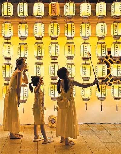 傍晚,江苏游客陈晓莉身着水绿色襦裙,在镜头前熟练地调整姿势……她身后,是江西省南昌市滕王阁景区北园的288米灯笼长墙。