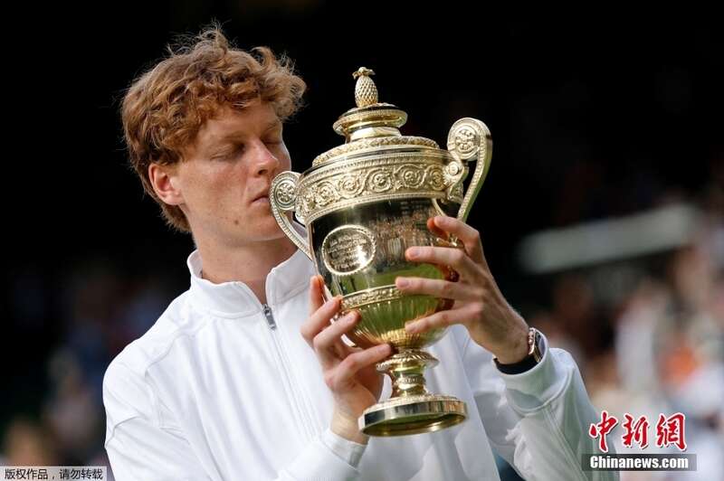 当地时间7月13日,在英国伦敦举行的2025温布尔登网球公开赛男单决赛中,意大利球星辛纳以3比1击败西班牙球星阿尔卡拉斯,首次夺得温网男单冠军。图为辛纳亲吻奖杯。
