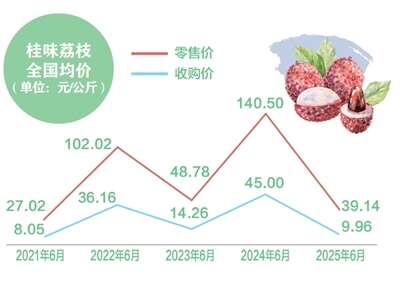 放眼批发市场,价格跳水的势头更明显。在广东广州江南果菜批发市场,妃子笑荔枝6月底价格为每公斤4至4.5元,而去年同期价格为每公斤14至16元。