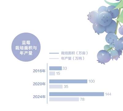 消费者“蓝莓自由”的背后是迅速壮大的产业。数据显示:2024年,我国蓝莓栽培面积144万亩,较2020年增加44万亩,较2016年增加111万亩;全国蓝莓总产量78万吨,分别比2020年和2016年增加43万吨和63万吨。