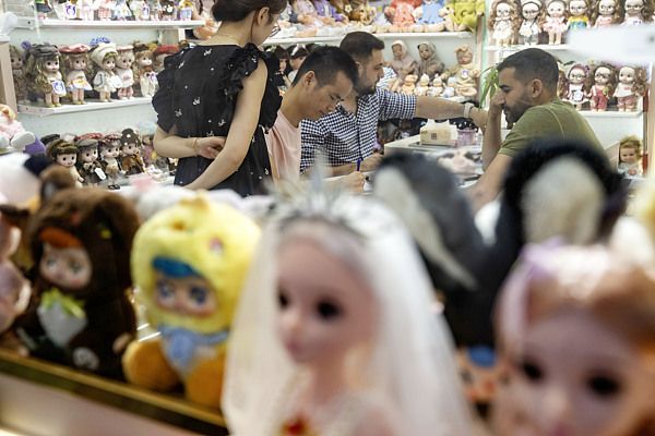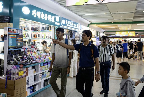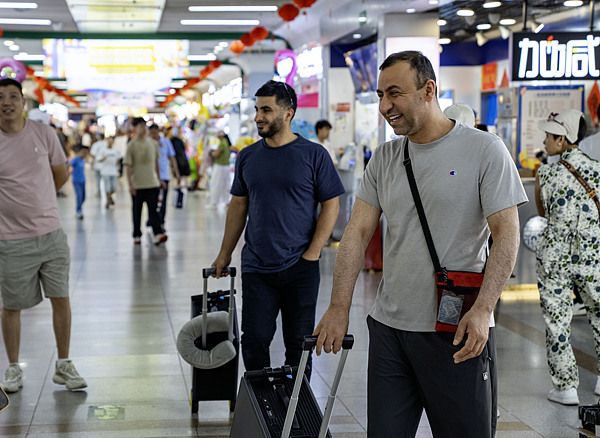 2025年7月14日,义乌国际商贸城内不少外国客商正在选购商品。