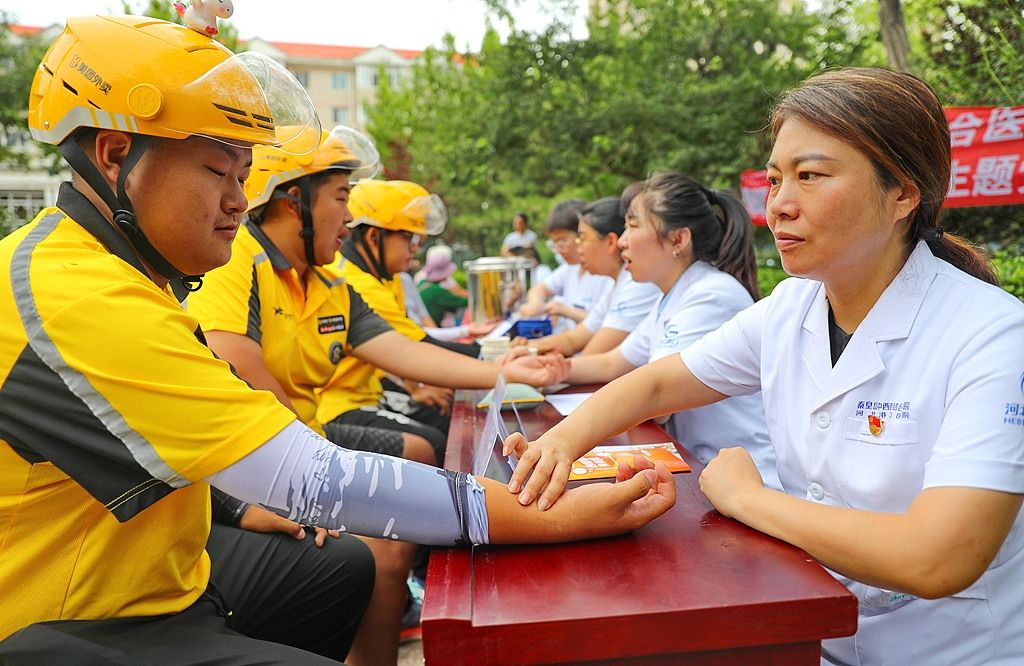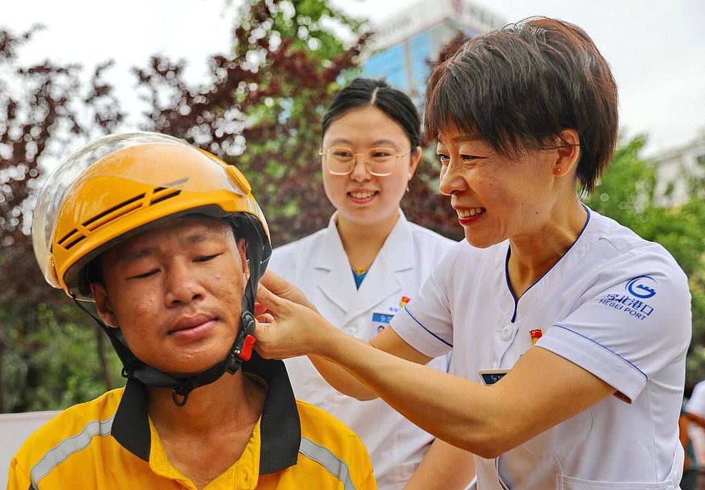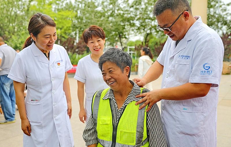 2025年7月15日,河北省秦皇岛市,海港区海滨路街道开滦路社区广场内,河北港口集团有限公司秦皇岛中西医结合医院医护工作者为环卫工人义诊。当日,河北省秦皇岛市海港区海滨路街道开滦路社区联合河北港口集团有限公司秦皇岛中西医结合医院以及多家爱心企业开展“关爱户外劳动者 传递爱心不停歇”活动。该活动组织片区内环卫工人、外卖小哥走进社区广场,通过医护工作者为户外劳动者义诊、爱心企业工作人员为户外工作者送上“健康礼包”等方式,以实际行动表达对户外工作者的关心与关爱。