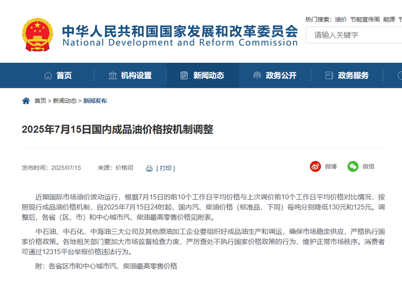 近期国际市场油价波动运行,根据7月15日的前10个工作日平均价格与上次调价前10个工作日平均价格对比情况,按照现行成品油价格机制,自2025年7月15日24时起,国内汽、柴油价格(标准品,下同)每吨分别降低130元和125元。调整后,各省(区、市)和中心城市汽、柴油最高零售价格见附表。