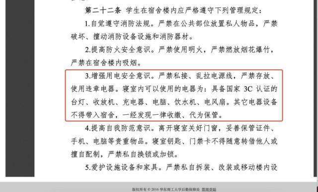 记者查询校方后勤保卫处官网看到,学校曾发布一版印发于2022年7月的《学生宿舍管理办法》,第二十二条第3点为:“增强用电安全意识。严禁私接、乱拉电源线,严禁存放、使用违章电器。寝室内可以使用的电器为:具备国家3C认证的台灯、收放机、充电器、电脑、饮水机、电风扇。其他电器设备不得带入宿舍,一经发现一律收缴、代为保管。”此外,该管理办法中无其他条例涉及宿舍电器使用问题。