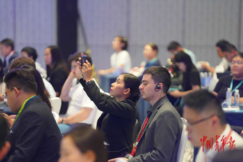 7月16日,江苏苏州,2025年世界青年发展论坛绿色消费与可持续发展主题论坛上,参会嘉宾在听会时拍照。中青报·中青网记者 田嘉硕/摄