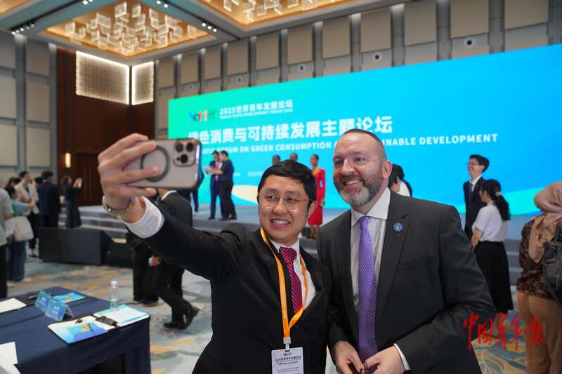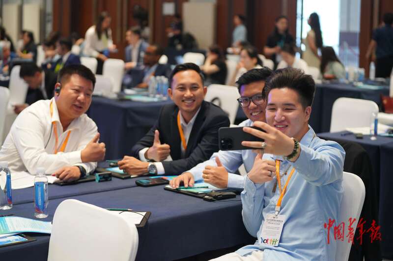 7月16日,江苏苏州,2025年世界青年发展论坛绿色消费与可持续发展主题论坛结束后,参会嘉宾举起手机自拍留念。中青报·中青网记者 田嘉硕/摄