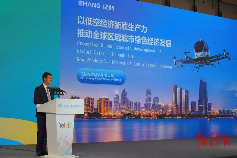 7月16日,江苏苏州,2025年世界青年发展论坛绿色消费与可持续发展主题论坛上,亿航智能副总裁贺天星发表主旨演讲。中青报·中青网记者 田嘉硕/摄