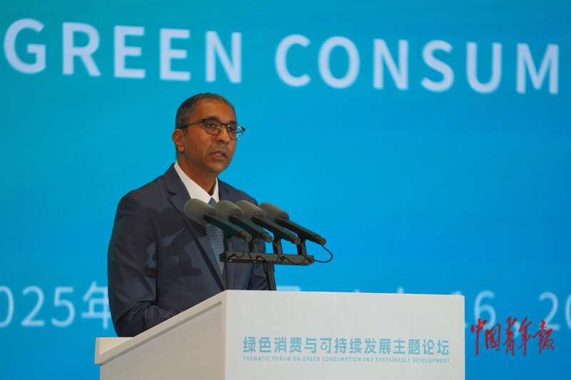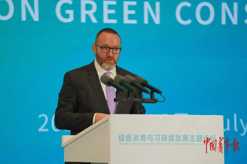 7月16日,江苏苏州,2025年世界青年发展论坛绿色消费与可持续发展主题论坛上,联合国开发计划署驻华副代表乔展发表主旨演讲。中青报·中青网记者 田嘉硕/摄