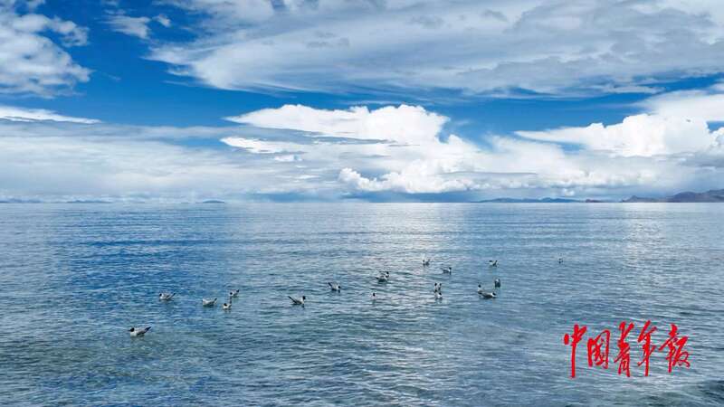 纳木措景区,碧空如洗,湖水澄澈如镜,水鸟翔集。中青报·中青网记者纪佳琦摄