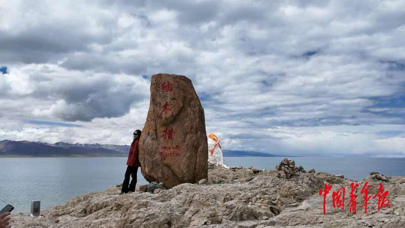 游客与纳木措景观石合影。中青报·中青网记者纪佳琦摄