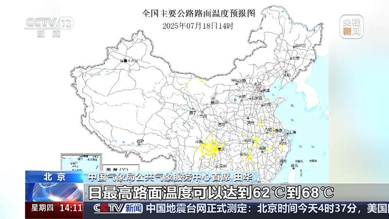 中国气象局公共气象服务中心首席 田华:从未来几天的路面温度变化来看,在四川盆地、湖南、湖北、江西、浙江等地的高速公路,日最高路面温度仍然可以达到55℃以上。特别是途经湖南、湖北、重庆、四川境内的福银、沪蓉、沪渝、京昆、二广等高速公路的部分路段,日最高路面温度可以达到62℃~68℃,对交通通行有一定影响。高温条件下可以引发车辆的爆胎,也容易导致驾驶人员疲劳。因此建议自驾出行的公众在出行前及时做好车胎的保养和检查,防范爆胎事故的发生。另外在驾驶途中也尽量避免高温时段出行,也避免长时间疲劳驾驶,适时休息。