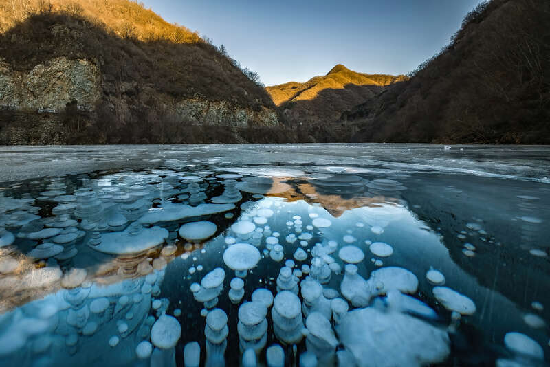就像煮面条,火大火小会影响面条的软硬,宋孟杰的研究团队发现,水结冰的速度,能决定冰里留下哪种身材的气泡。降温快、结冰快,气泡来不及反应,就被困在其中,身材就和鸡蛋一样椭圆;降温慢一点,预留些逃跑时间,气泡已经动身,就会像针一样细长,若是再慢,气泡便能自由逃出,冰层不会留下气泡的痕迹,变得完全透明。