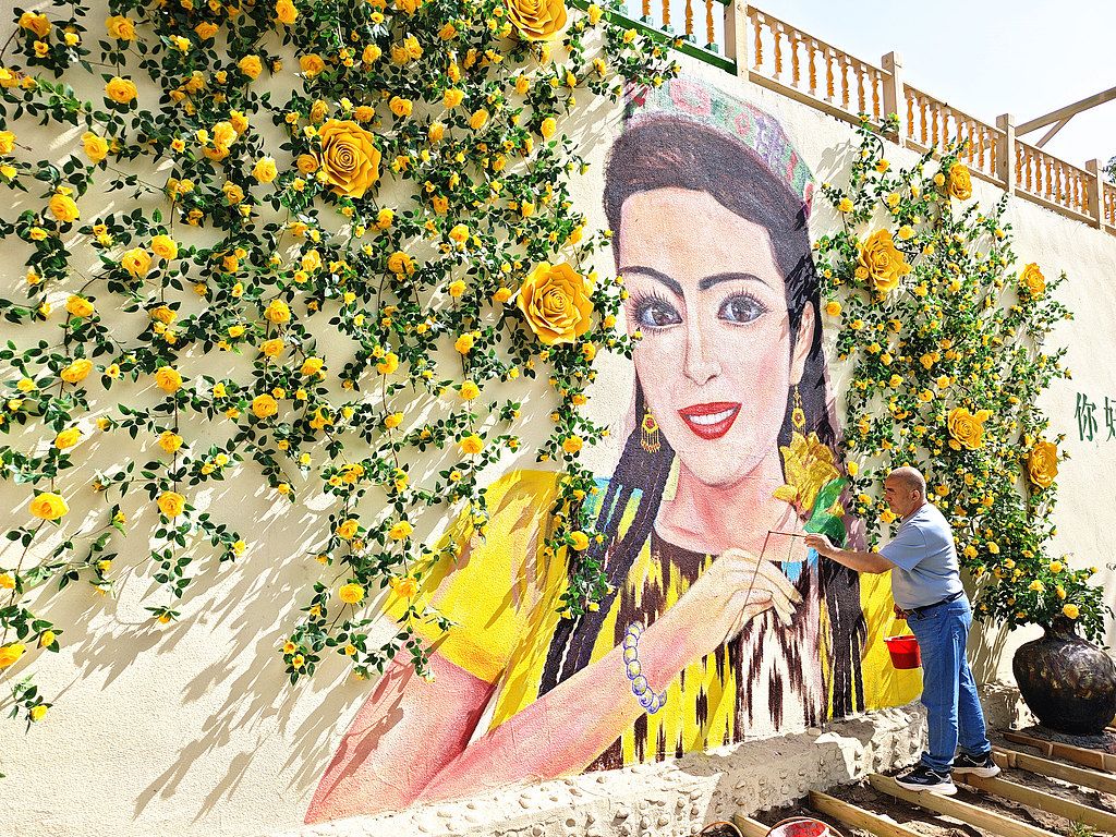 2025年7月18日,新疆阿克苏地区,阿瓦提县阿瓦提镇博斯坦社区,农民画家正绘就美丽“古丽”。近年来,阿瓦提以党建为引领,挖掘农民画家资源,打造特色文旅线路,厚植党建根基,借艺术拓宽乡村文旅路径,赋能乡村振兴。