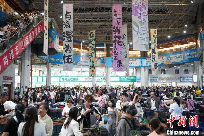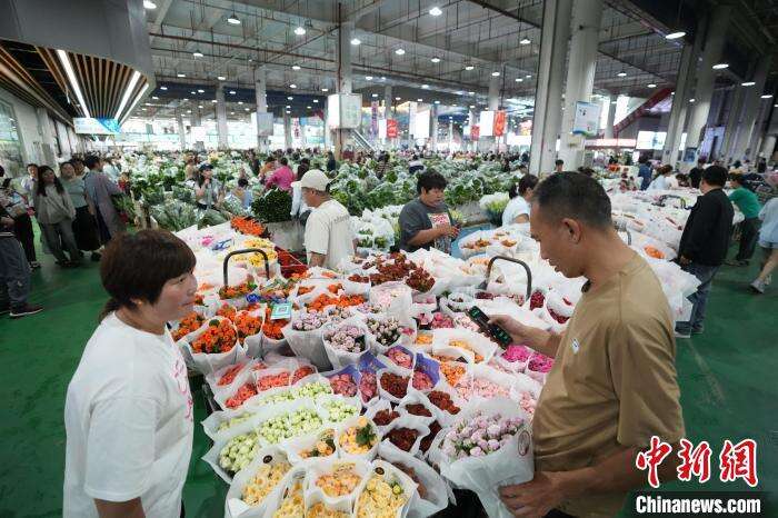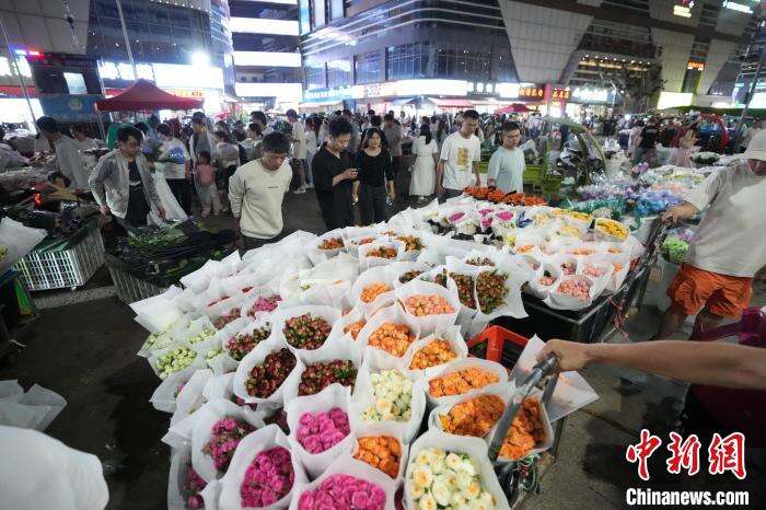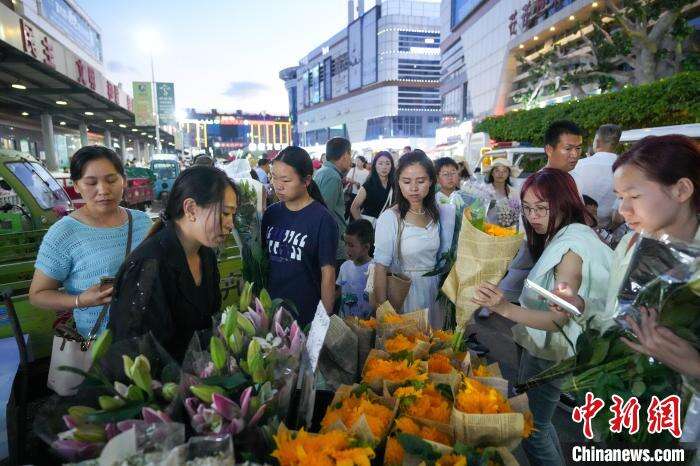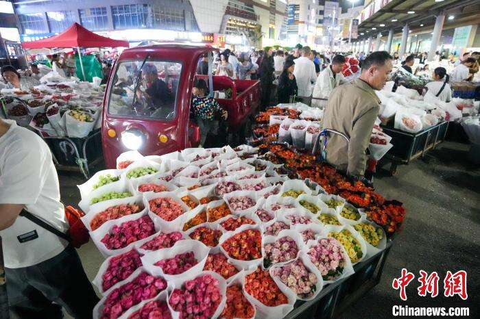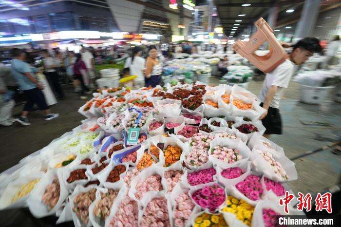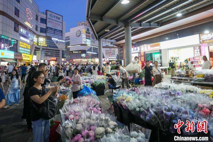 7月18日晚,昆明斗南花卉市场迎来繁忙的夜市,吸引众多游客前来感受亚洲花都的独特魅力。中新社记者 刘冉阳 摄