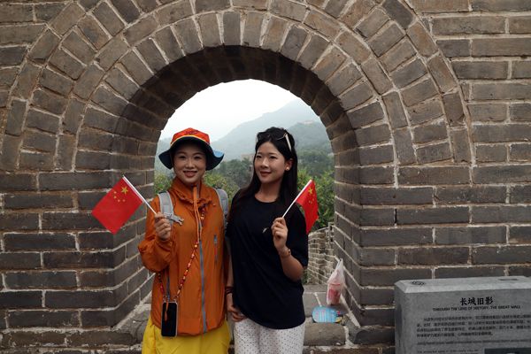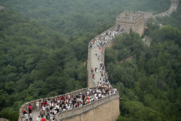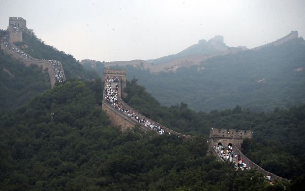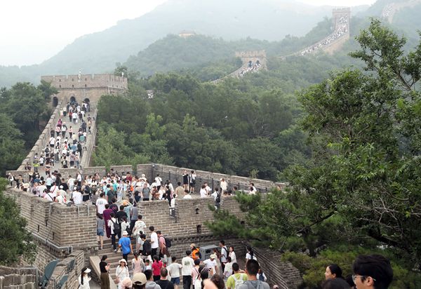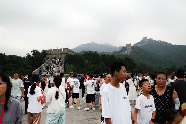 2025年7月19日,北京延庆,游客攀登位于北京市延庆区的八达岭长城。进入暑期后,北京八达岭长城迎来旅游高峰期。虽然天气炎热,仍有大批国内外游客接踵而来。