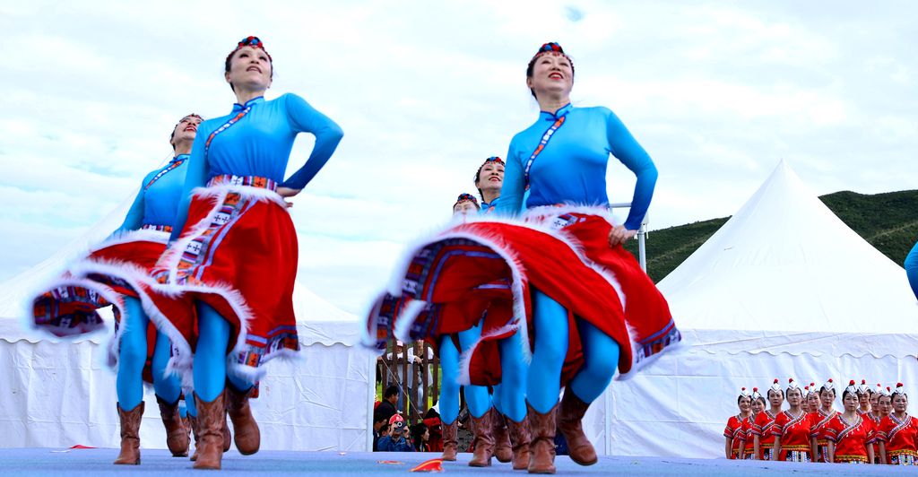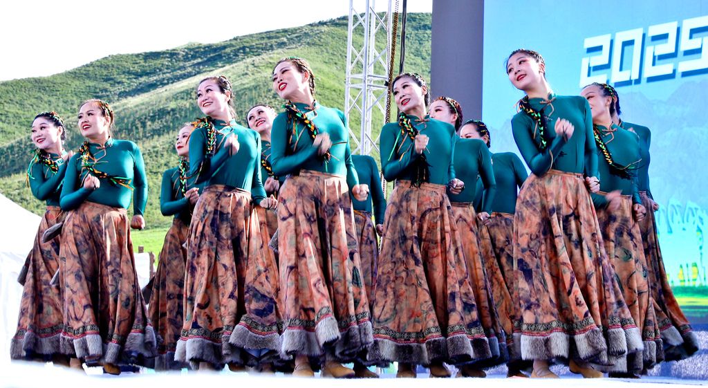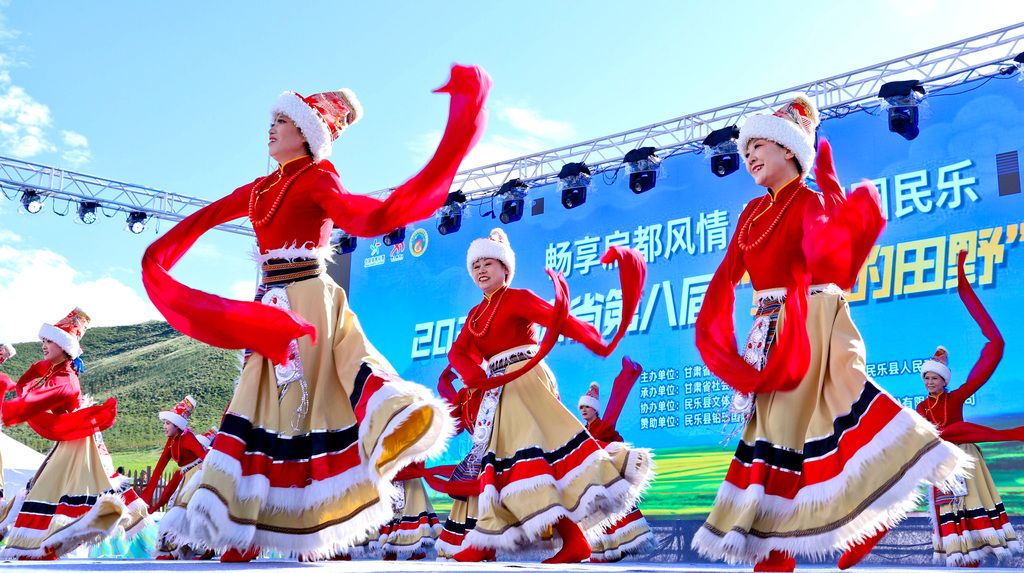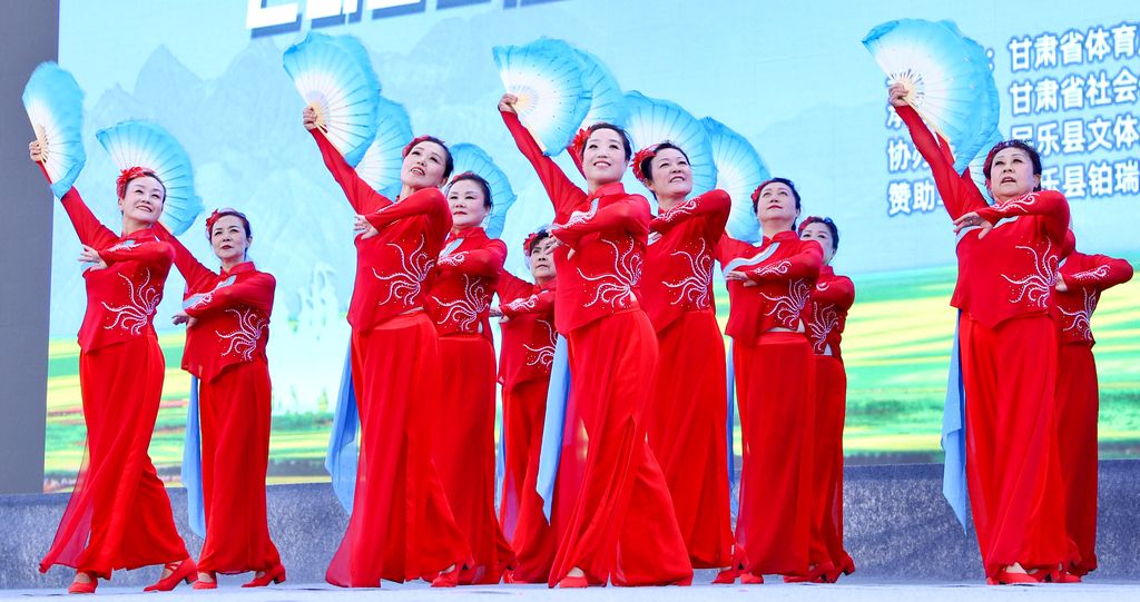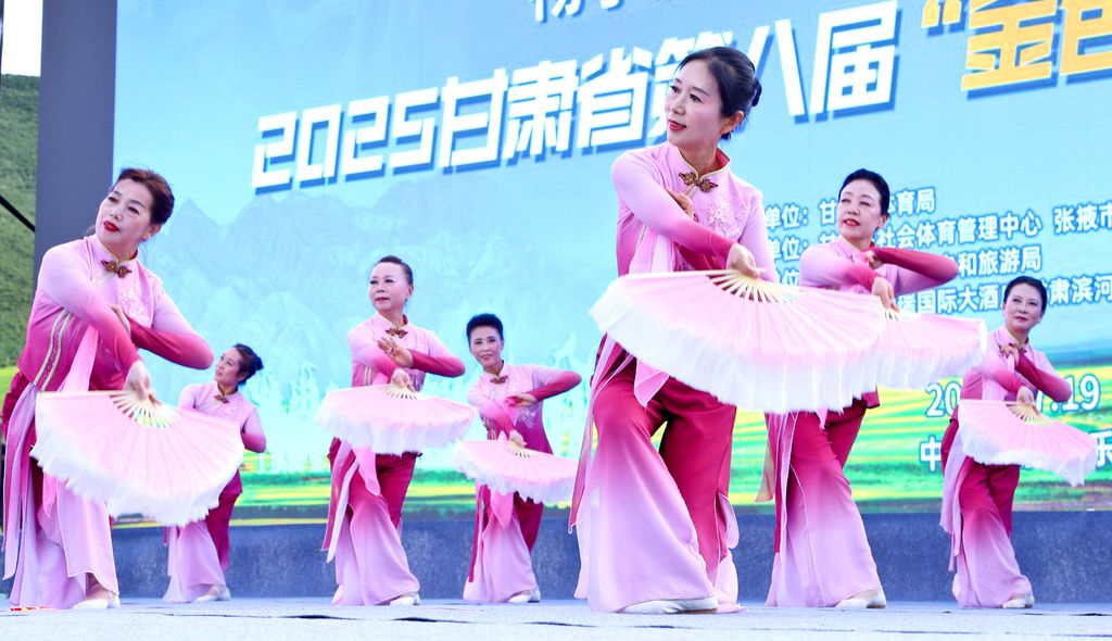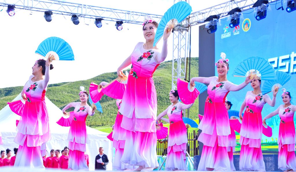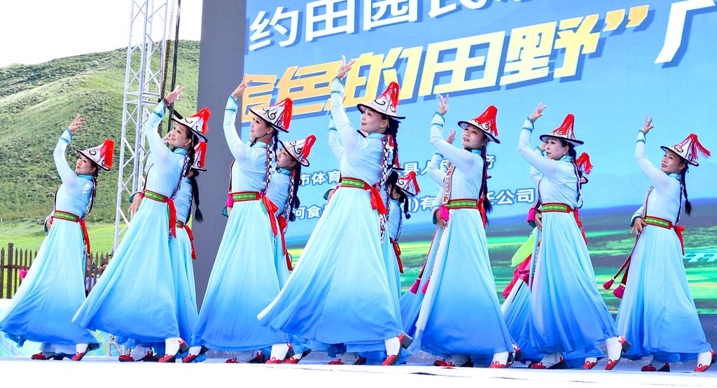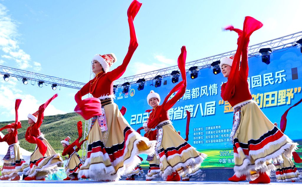 2025年7月19日,在甘肃省张掖市,民乐县扁都口景区举行的2025年甘肃省第八届“金色的田野”广场舞大赛比赛现场,参赛代表队的队员们在表演舞蹈《藏族儿女心向党》。