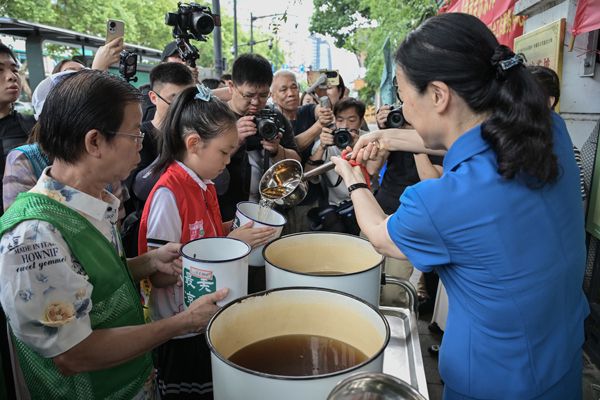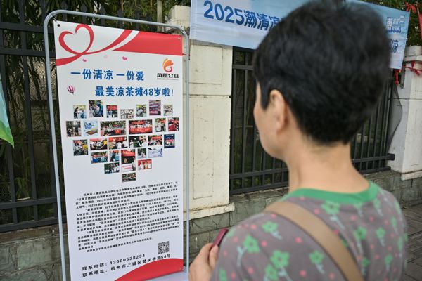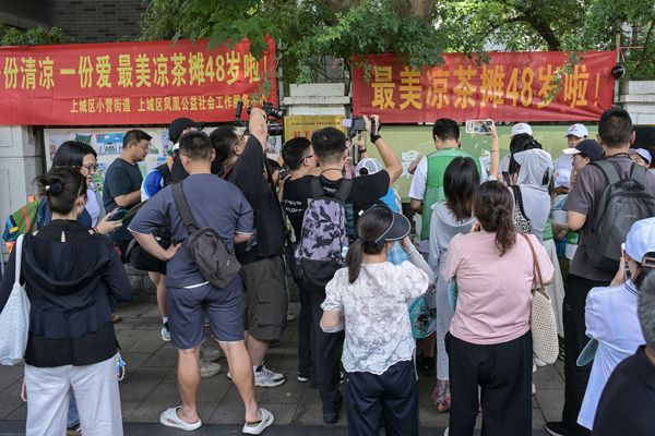 2025年7月20日,浙江省杭州市,在建国中路锅子弄口,小小的凉茶摊又出摊了。绿色的四轮推车一摆,两个不锈钢大茶桶一放,延续了48年的“夏日限定”如约而至。这家爱心凉茶摊,每年头伏出摊、出伏收摊,被誉为杭城“最美凉茶摊”。