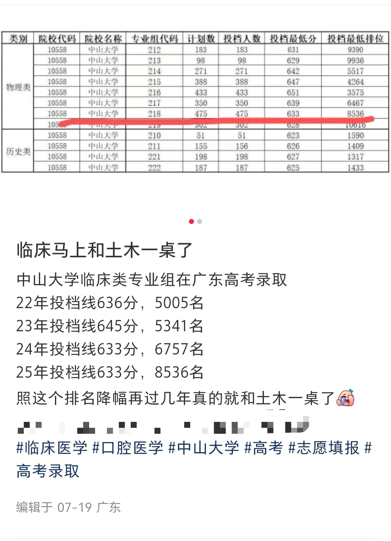 往年的报考大热门临床医学及相关专业,今年却因为录取分数和位次号明显下降,被网友戏称和土木工程一起成了“过气热门专业”。