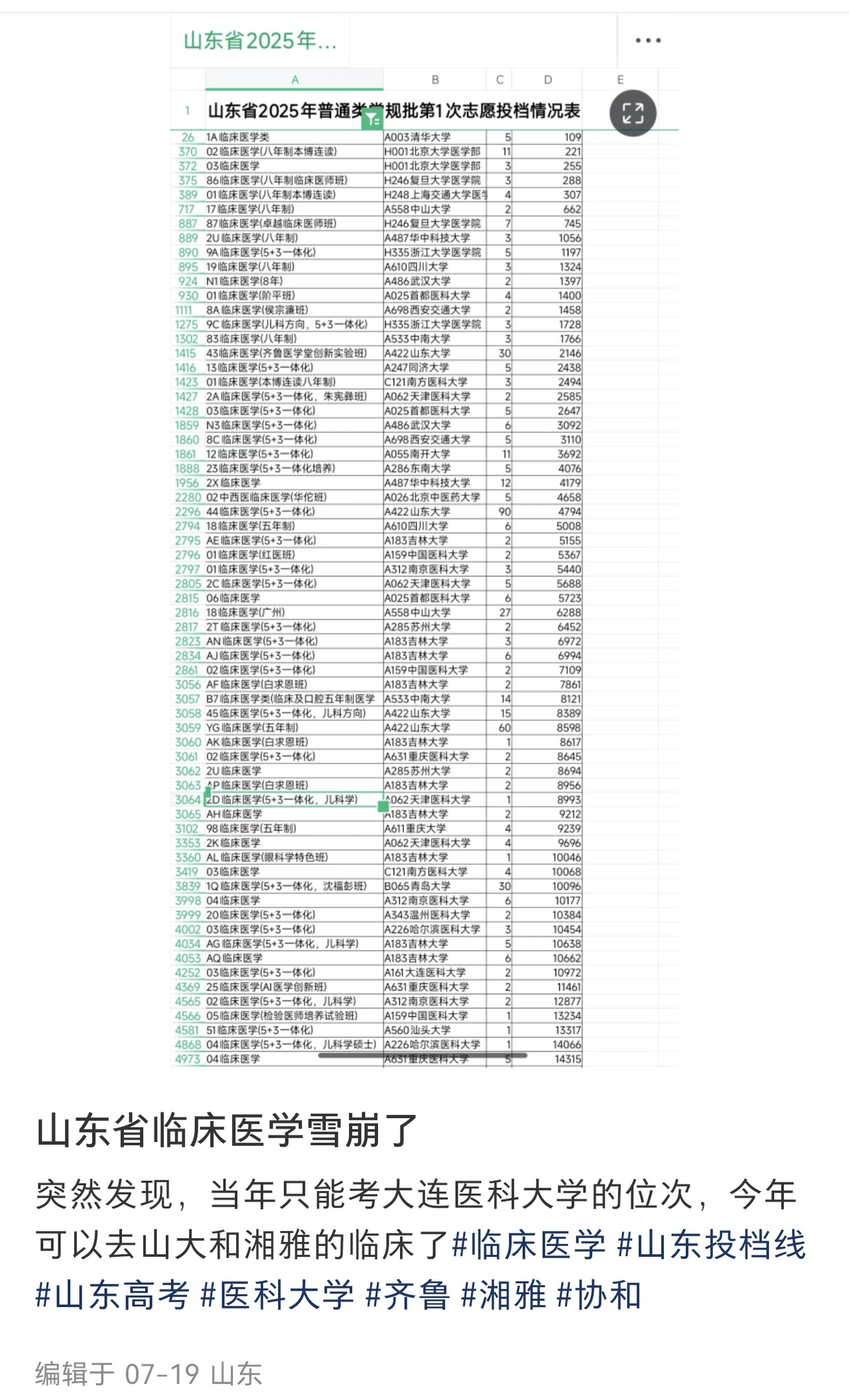 比浙江早几天完成高考一批次录取的广东和山东,也同样出现了临床医学类专业“爆冷”的现象。