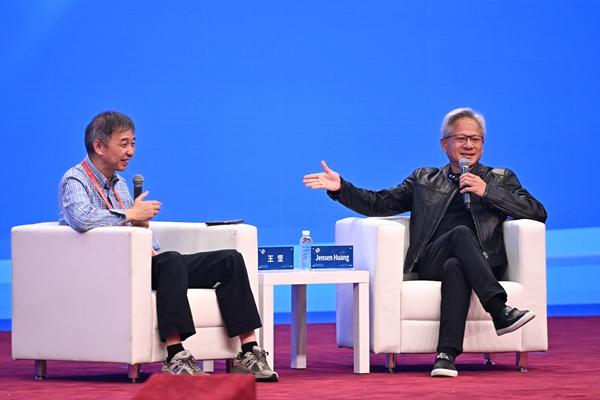 黄仁勋穿着标志性皮夹克小跑上台,与之江实验室主任、阿里云创始人王坚开启了一场关于AI的围炉对话。这也是本场活动最受期待的环节之一。