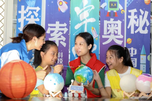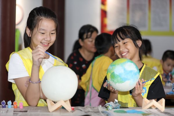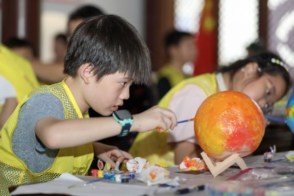 2025年7月22日,福建省福州市,一场以“仰望苍穹探星语”为主题的天文科普夏令营拉开序幕,志愿者正在指导青少年手绘月球灯,让孩子们畅享快乐暑期生活。