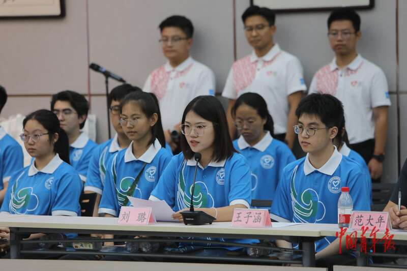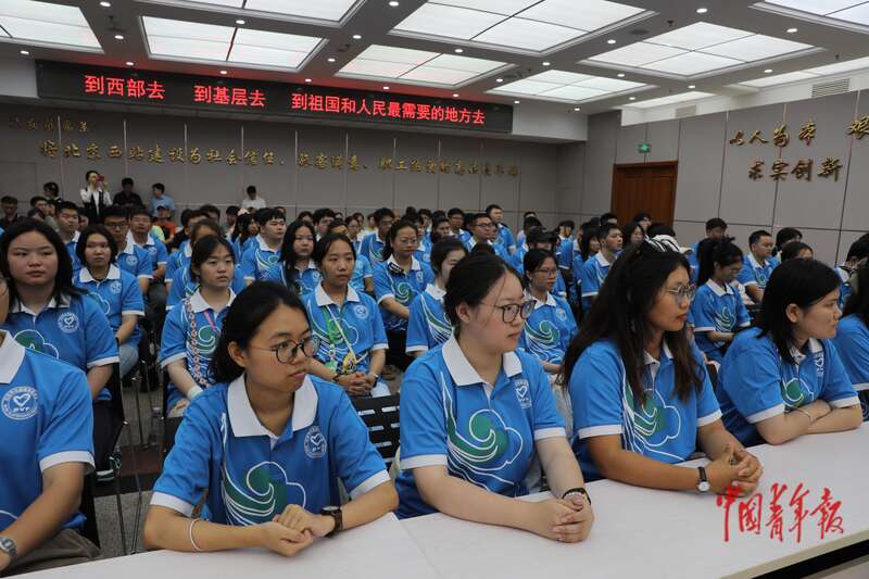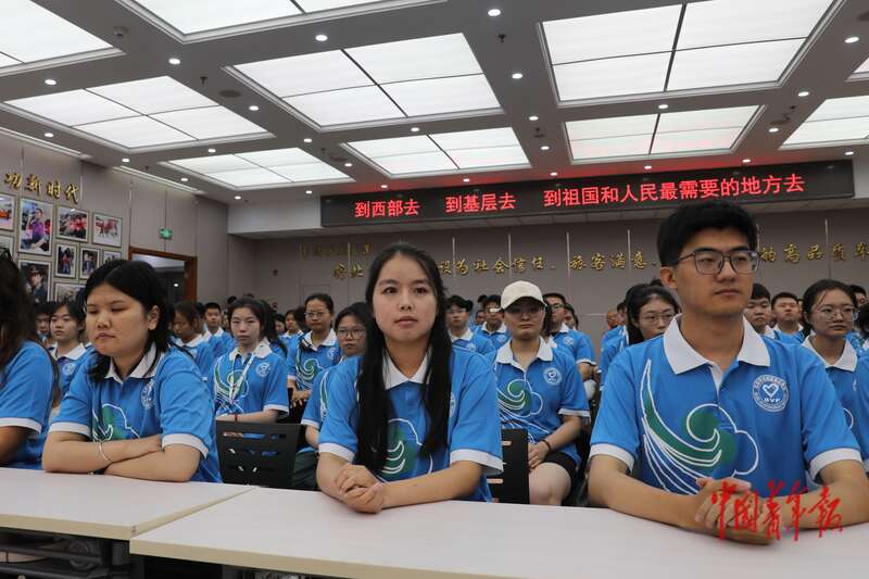7月22日,北京西站,2025年北京市大学生志愿服务西部计划志愿者出征活动上,志愿者代表们聆听发言。中青报·中青网记者 孔斯琪/摄
