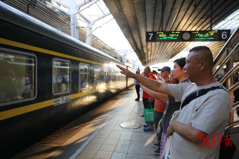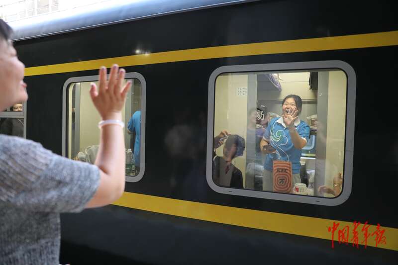 7月22日,北京西站,西部计划志愿者在驶向新疆的列车上向车窗外挥手告别。中青报·中青网记者 孔斯琪/摄