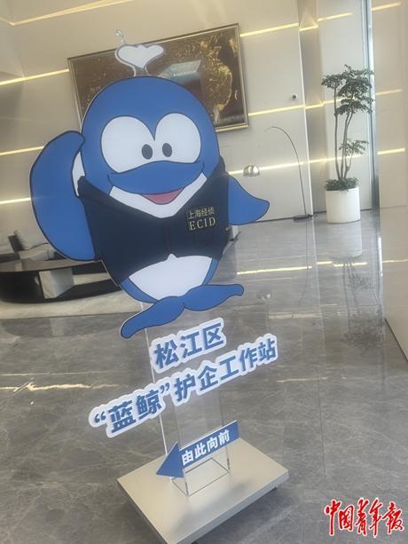 摆放在松江区“蓝鲸”护企工作站里的“蓝鲸”卡通形象。中青报·中青网记者 何春中/摄
