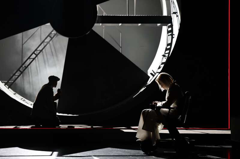 舞台整体采用极简的现代主义美学:高对比度的配色方案、锐利的几何切割光影、工业质感的金属构件,共同构建出一个既具有实验室精确性又充满表现主义张力的戏剧空间。一座以经典核辐射标志为灵感打造的直径5米的巨型三叶扇,成为舞台装置的核心,以最简洁的形式传递出最强烈的危险警示。