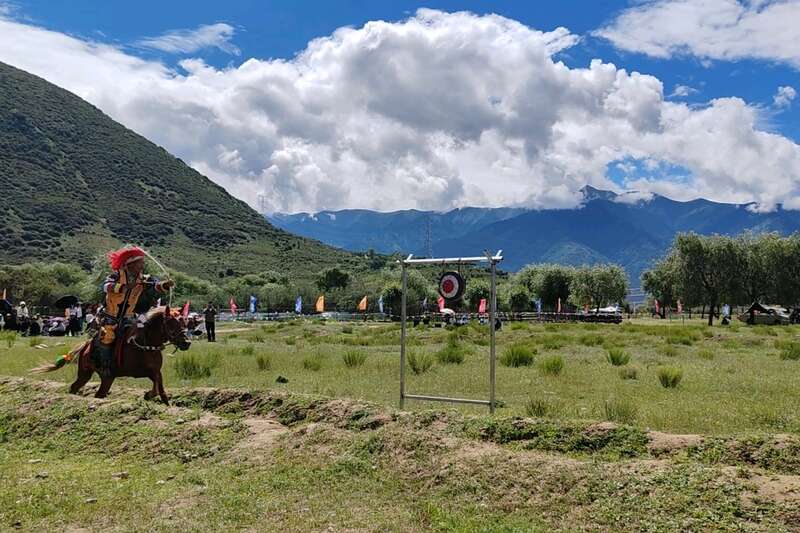 不只桃花节,嘎拉村的四季都很热闹。记者来到嘎拉村的这天,当地正在举办第八届尼洋旅游文化节,村民和游客围成一圈观看赛马和响箭比赛。参加比赛的选手一边策马奔腾,一边射向悬挂的箭靶,引来一阵阵喝彩声。