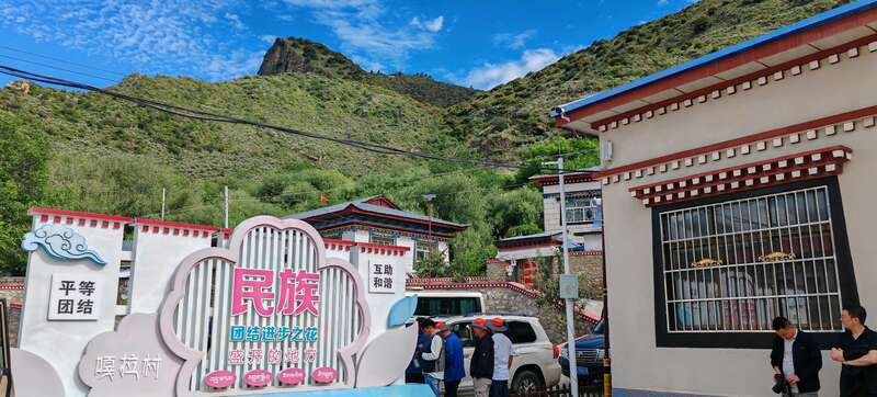 如今的嘎拉村真是一处“世外桃源”。漫步嘎拉村,村道整洁,溪流清澈,到处生机盎然。蓝天白云下,一栋栋藏式民居掩映于苍翠群山间,漫山遍野的桃林令人心旷神怡。村口路边墙壁上的“绿水青山就是金山银山”红色大字十分醒目。