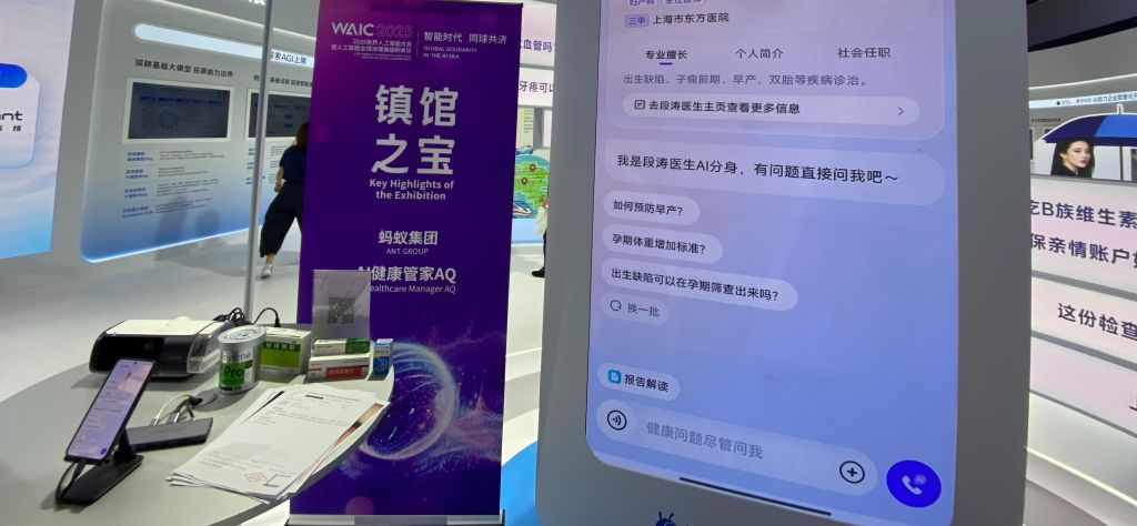 在蚂蚁集团展区,AI健康管家“AQ”也引来参观者的关注。体验的观众问及“最近为什么提不起精神?”或上传体检报告,AQ能给出诊断建议,并支持一键接入AI诊室深度问询,同时对接线上挂号或线下医院资源。据了解,“AQ”基于蚂蚁医疗大模型开发,包含问健康、读报告、测疾病、管慢病等超100项AI功能,并适配多款主流可穿戴和慢病管理设备。