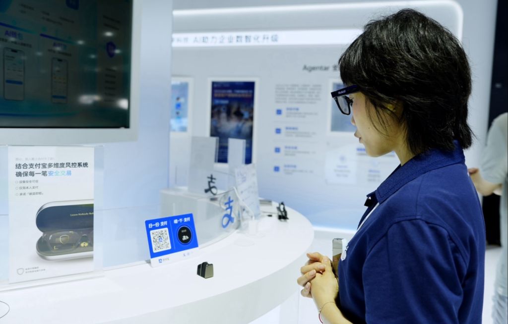 展会上,参观者佩戴智能眼镜体验支付宝“看一下支付”功能。受访者 供图