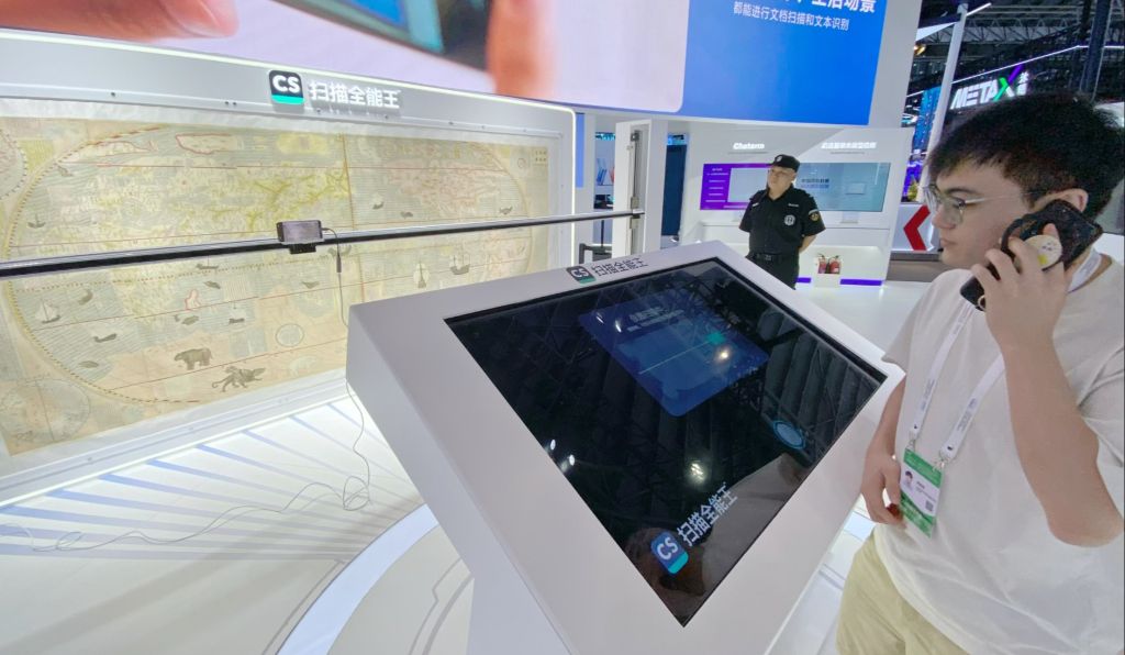合合信息展台工作人员告诉记者,《坤舆万国全图》原件成图于1608年,长3.85米,宽1.71米,是目前国内现存最早、最完整、内容最丰富的中文世界地图。借助“无限扫描”科技,观众通过上下、左右滑动手机拍摄视频,AI便可规避大尺寸文档图像拼接中常见的错位、细节模糊、色彩失真等问题,对局部视频进行“智能拼图”。