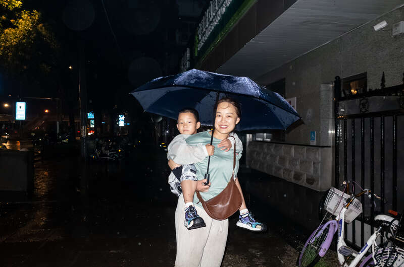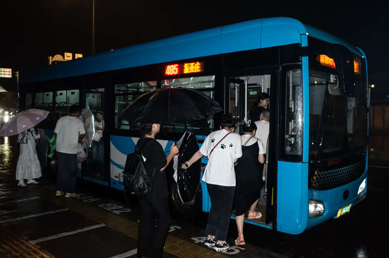 7月28日,北京,人们在雨中排队上公交车。姚沐含/摄