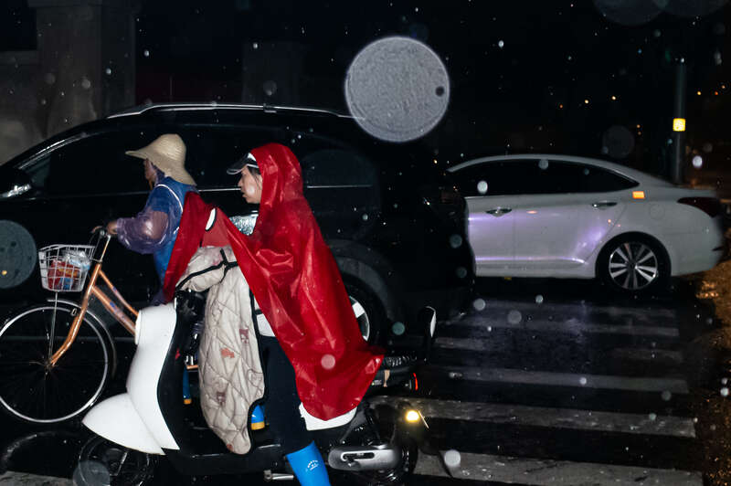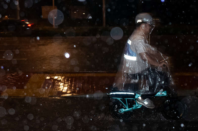 7月28日,北京,街道上身穿雨衣、戴着草帽的路人在街上骑车。当日,北京发布今年首个暴雨红色预警,晚上各区陆续出现强降雨。北京市应急管理局发布暴雨红色预警公众防护指引,请广大市民非必要不外出,注意交通安全,避免前往山区、河道等危险区域。29日7时10分,北京市气象台降级发布暴雨黄色预警信号,预计至29日20时,北京市降雨持续,部分地区小时雨强可达50毫米以上。姚沐含/摄