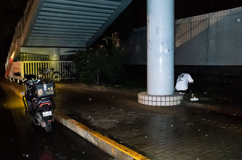 7月28日,北京,一名外卖员将电动车停在路边,在天桥下躲雨。姚沐含/摄