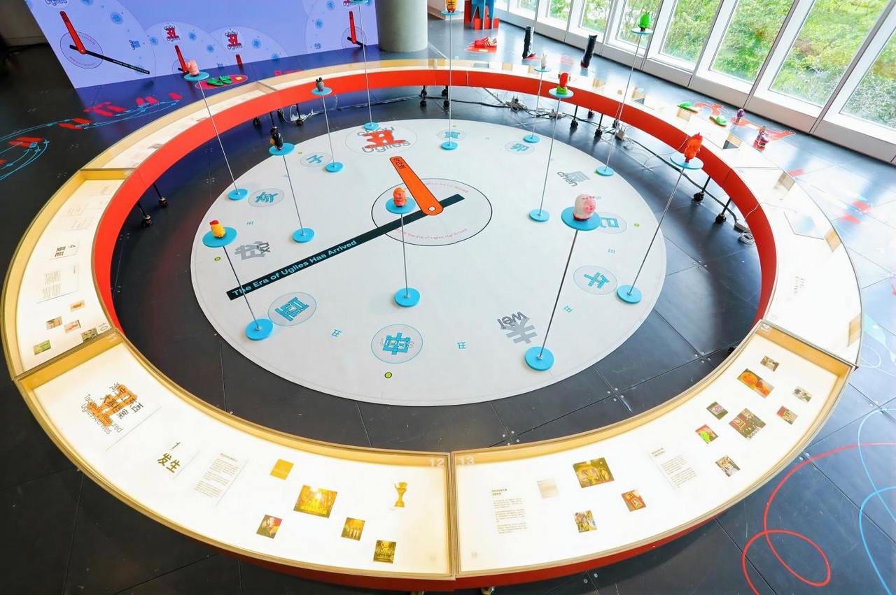 呼应“丑时已到”的主题,进门就能看见一个巨大的时钟装置映入眼帘。时钟指针特意停留在“丑时”时区,十二时辰时区分别对应着十二生肖的玩偶——第五届丑东西大赛的获奖商品,十二生肖灵性摆件。