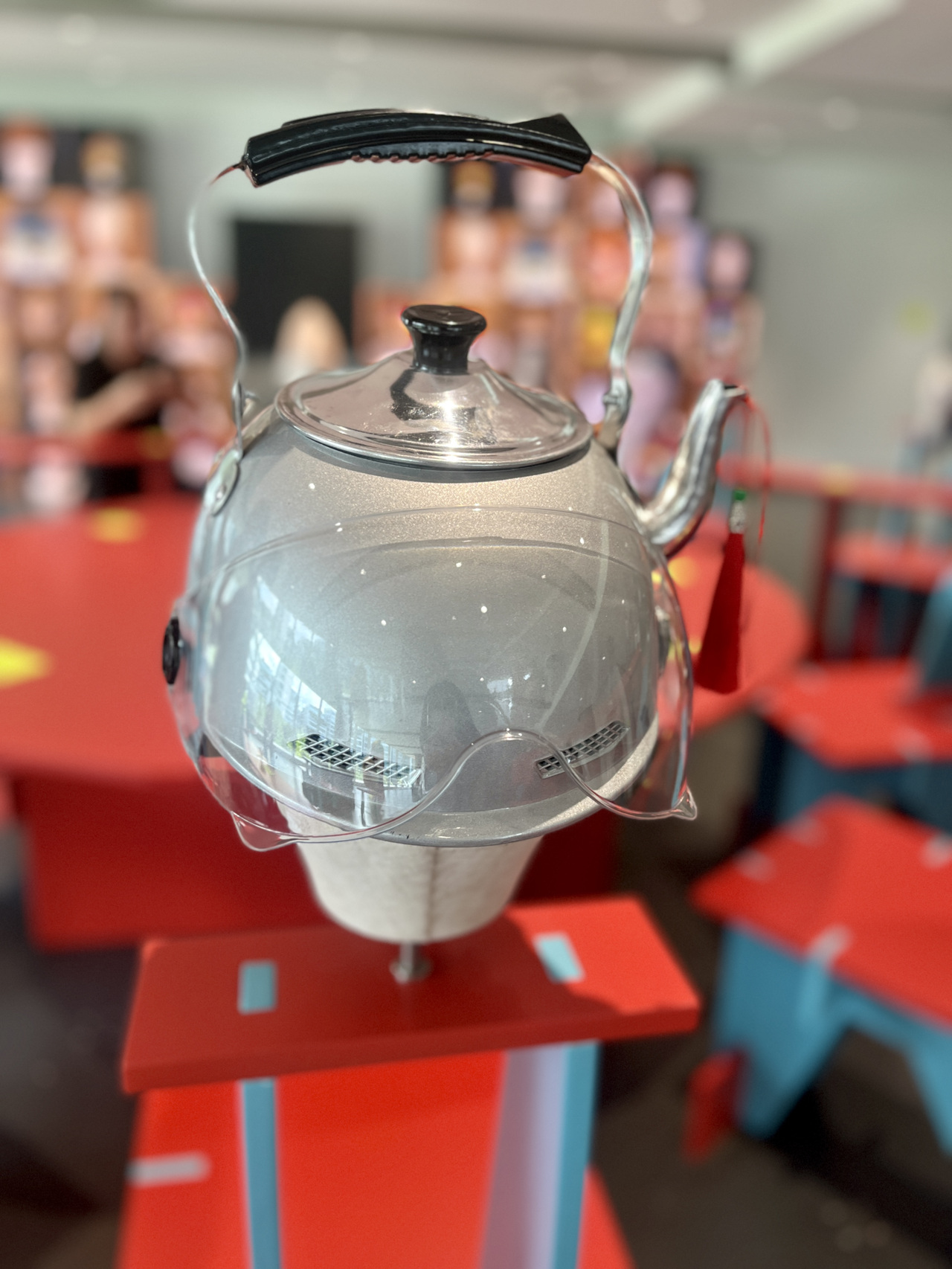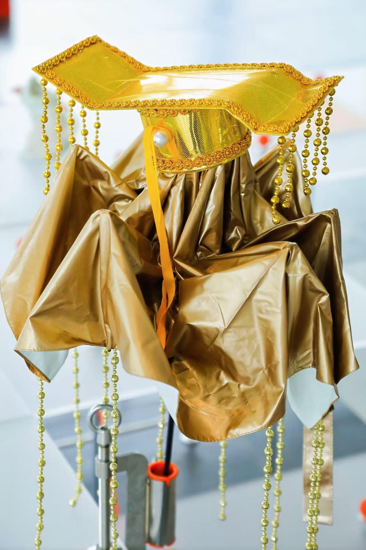 在展厅的另一边,大智若愚感的绿头鱼头套,曾经在一夜间成为年轻人放飞自我的首选装备;被明星在综艺节目上pick的脑花帽,被网友戏称为“出门带脑子的证据”;还有突破想象力的“开水壶头盔”、一个人撑起强大气场的“吾皇的伞”、不好意思正眼瞧的“碧绿青蛙勺子”……彼此声量相当,得到年轻人的无限认同,这些“丑东西”曾出现在“神仙打架”般的历届大赛名单上,如今难得一聚,同样引来怀旧网友打卡拍照。