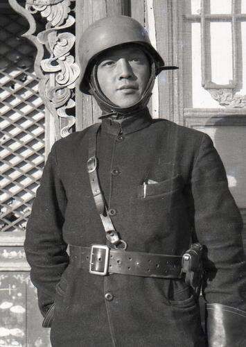 在绥远前线,方大曾寄给母亲一张自己身着戎装、头戴钢盔的照片。上面写着:“母亲大人存念 男小方摄于1936年冬时执行摄影工作 于绥东战地”。