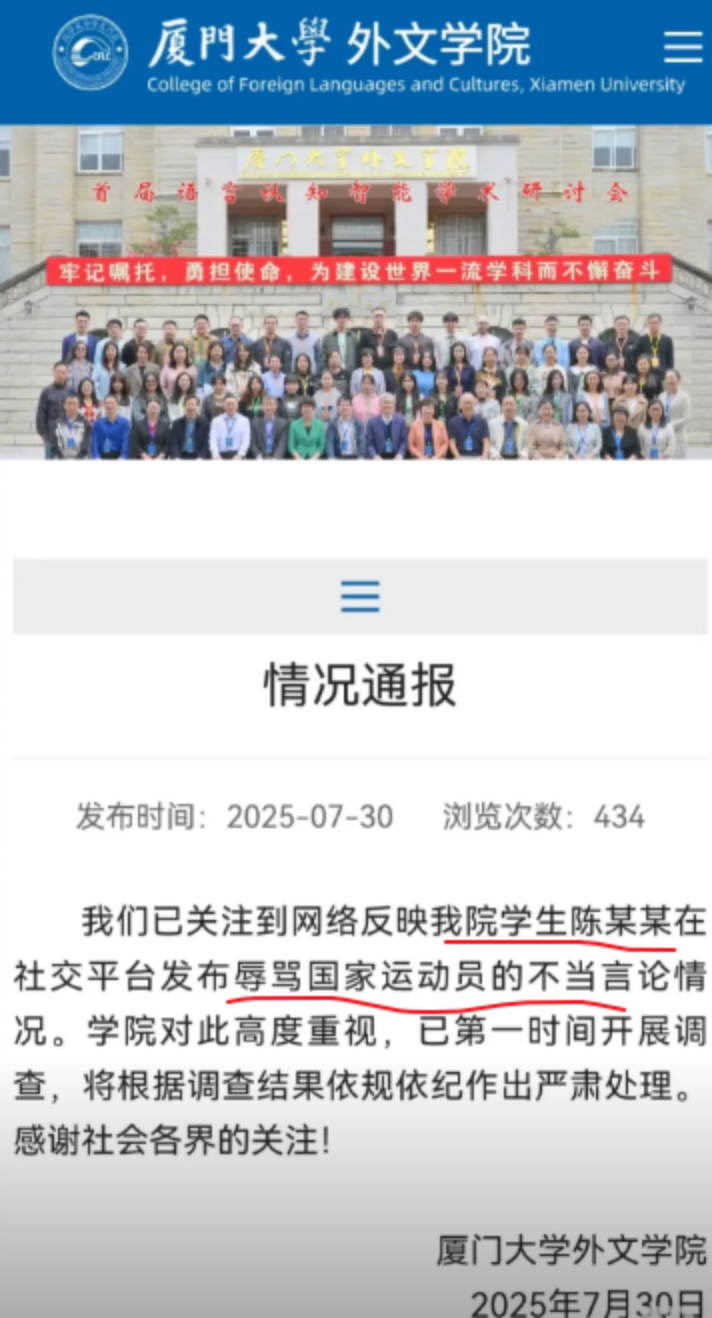 7月30日晚,厦门大学外文学院发布情况通报称,已关注到该校学生陈某某在社交平台发布辱骂国家运动员的不当言论情况,对此高度重视,已第一时间开展调查,将根据调查结果依规依纪作出严肃处理。