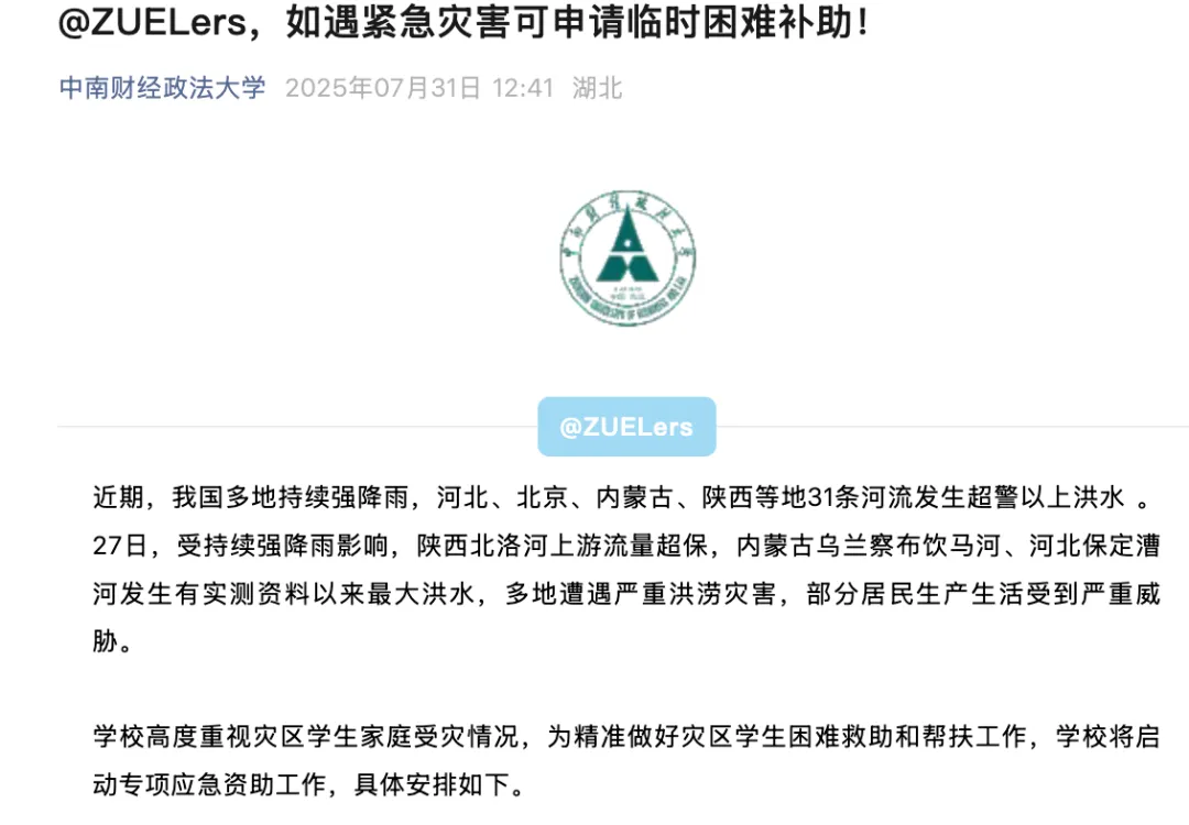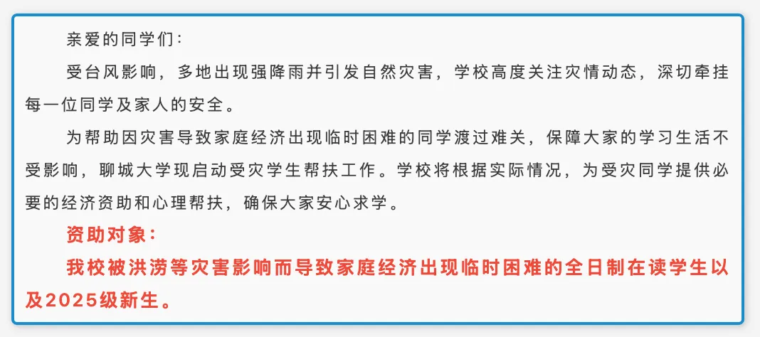 学校将根据实际情况,为受灾同学提供必要的经济资助和心理帮扶,确保大家安心求学。资助对象为被洪涝等灾害影响而导致家庭经济出现临时困难的全日制在读学生以及2025级新生。