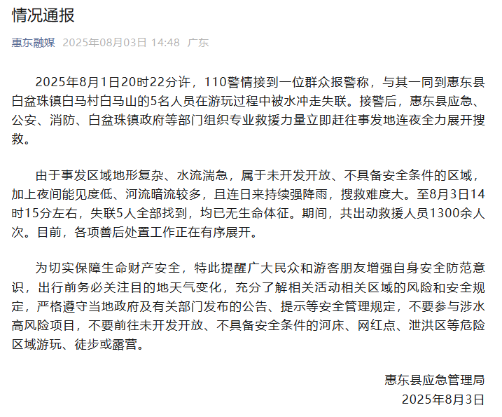 2025年8月1日20时22分许,110警情接到一位群众报警称,与其一同到惠东县白盆珠镇白马村白马山的5名人员在游玩过程中被水冲走失联。接警后,惠东县应急、公安、消防、白盆珠镇政府等部门组织专业救援力量立即赶往事发地连夜全力展开搜救。