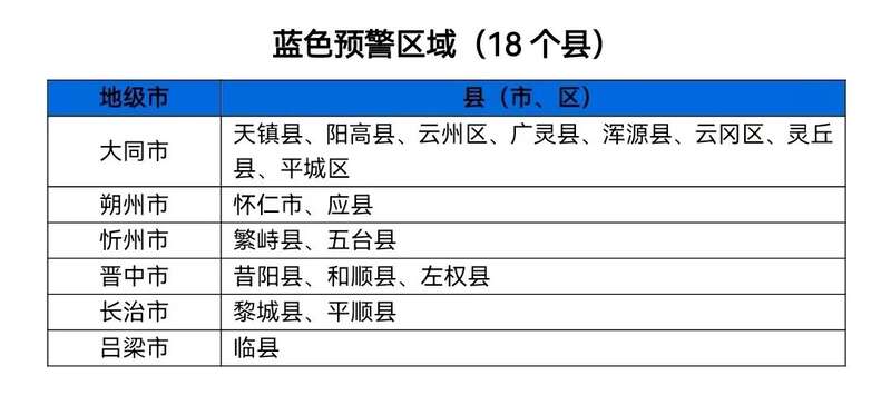 8月4日10时至8月4日20时,受强降雨影响,山西省大同、朔州东部、忻州东部、晋中东部、长治东部、吕梁中西部6个市18个县可能发生山洪(蓝色预警)。其他地区也可能因局地短历时强降水引发山洪灾害,请各地注意做好实时监测、防汛预警和转移避险等防范工作。